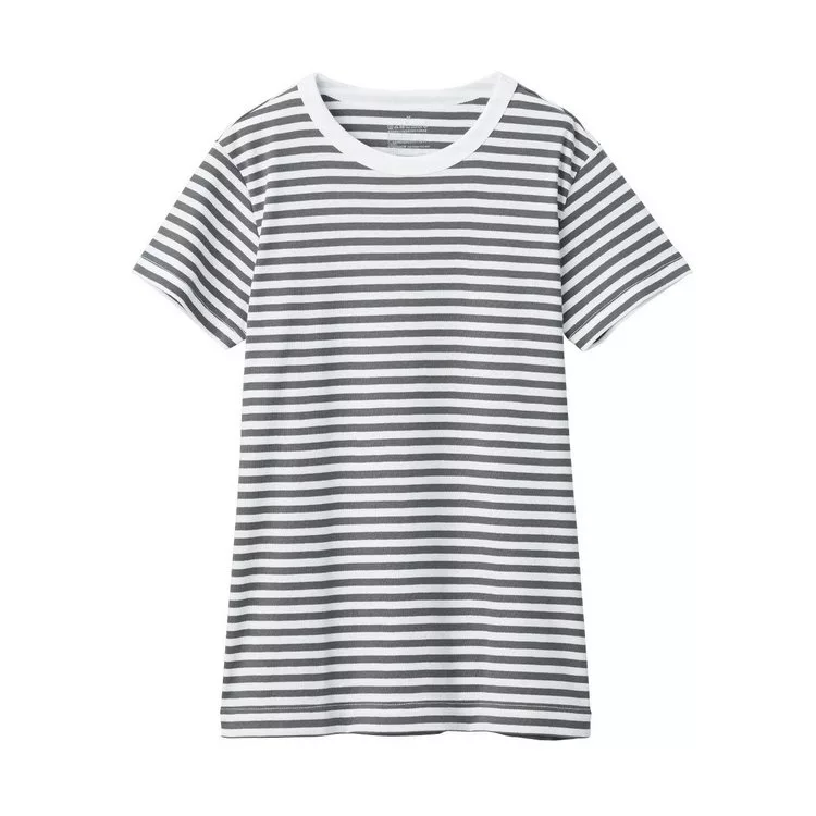 品名:女有機棉不易汗染針織圓領橫紋短袖T恤墨灰紋樣M