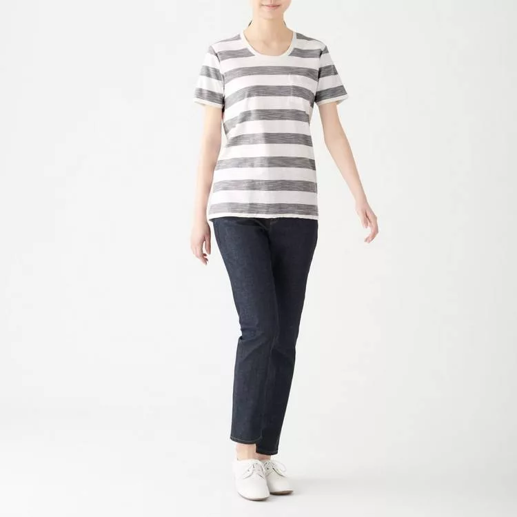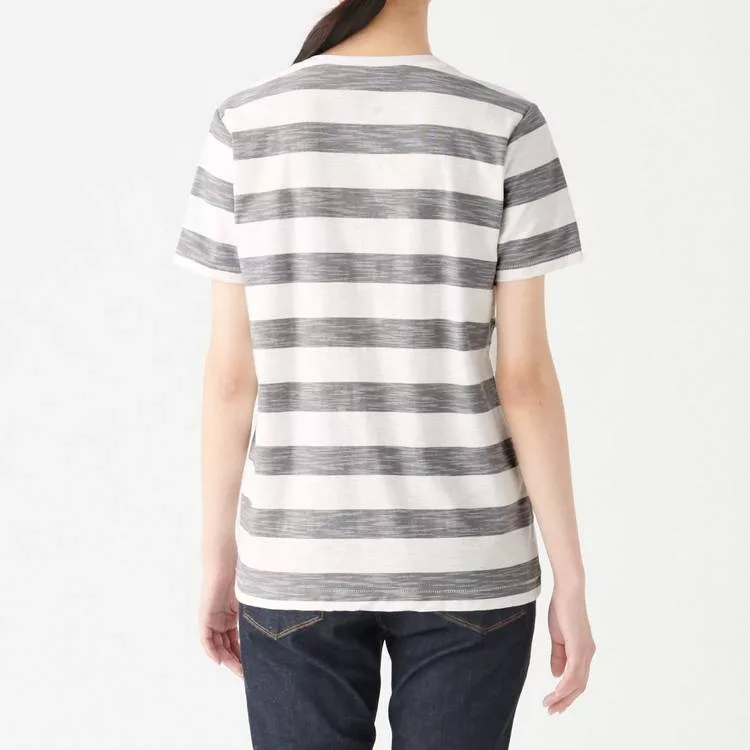 商品描述: [MUJI無印良品]女有機棉節紗天竺圓領橫紋短袖T恤S灰白紋樣