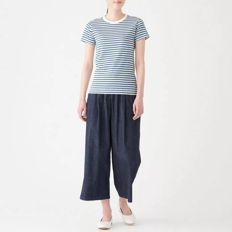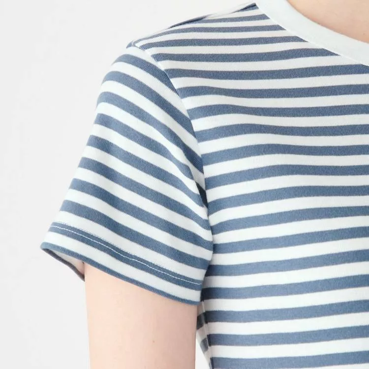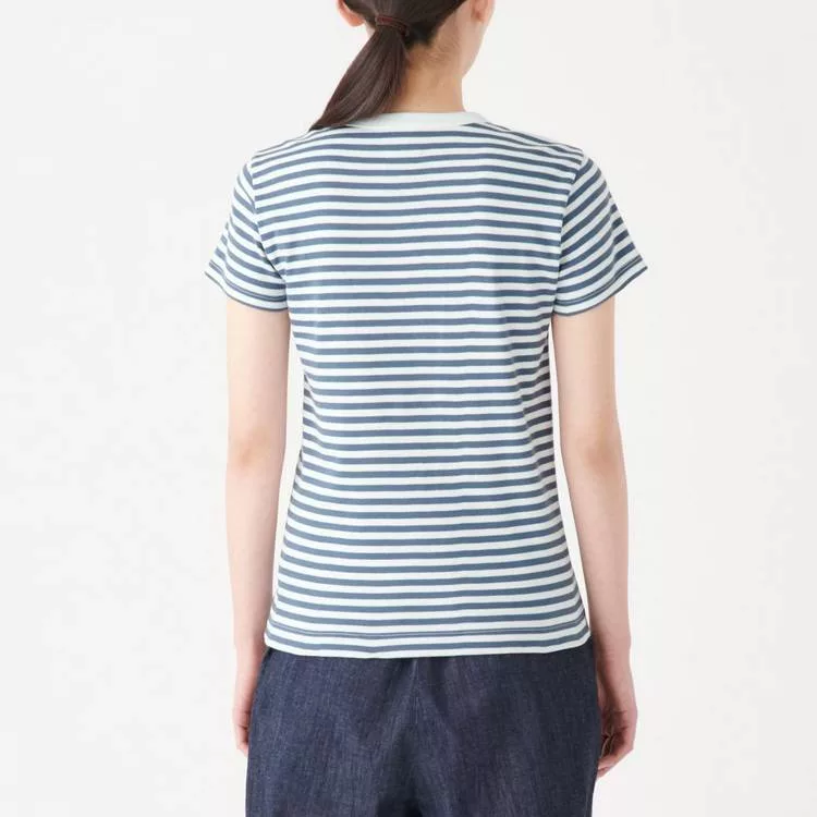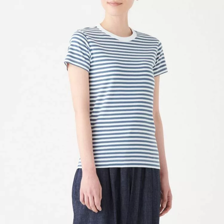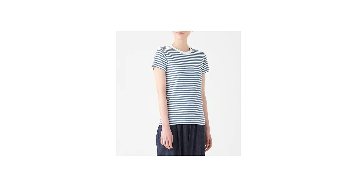 商品描述: [MUJI無印良品]女有機棉不易汗染針織圓領橫紋短袖T恤S煙燻藍橫紋