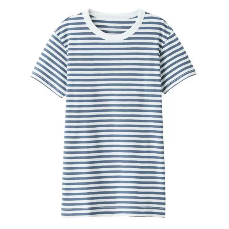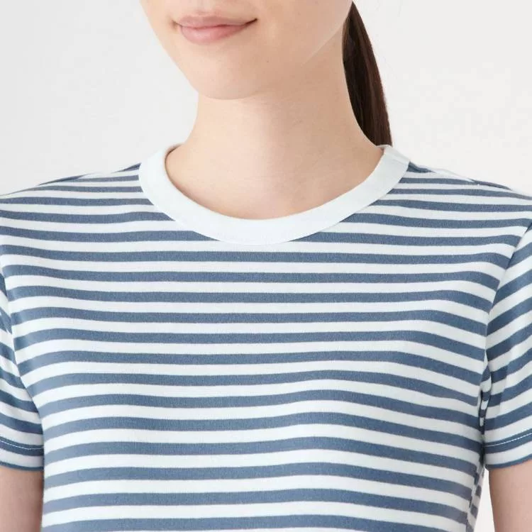 品名:女有機棉不易汗染針織圓領橫紋短袖T恤煙燻藍橫紋S