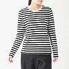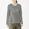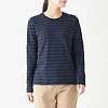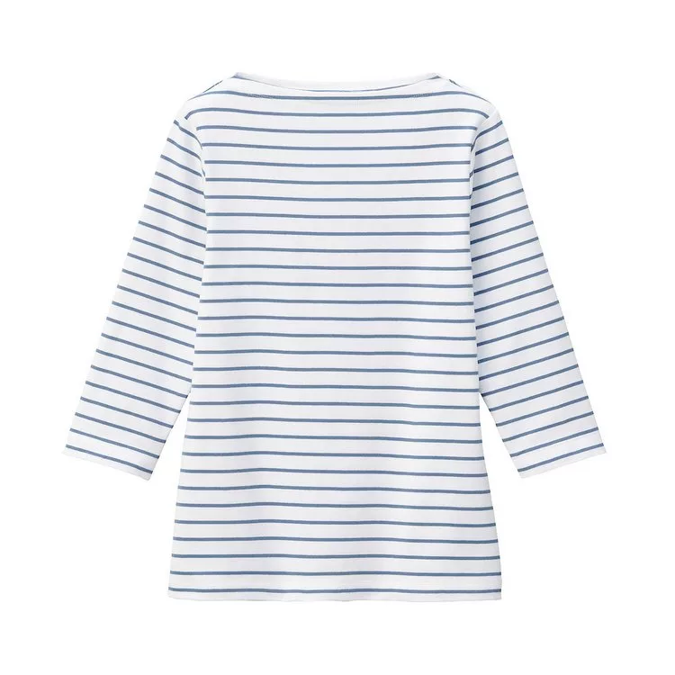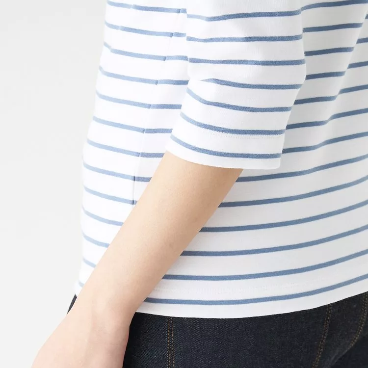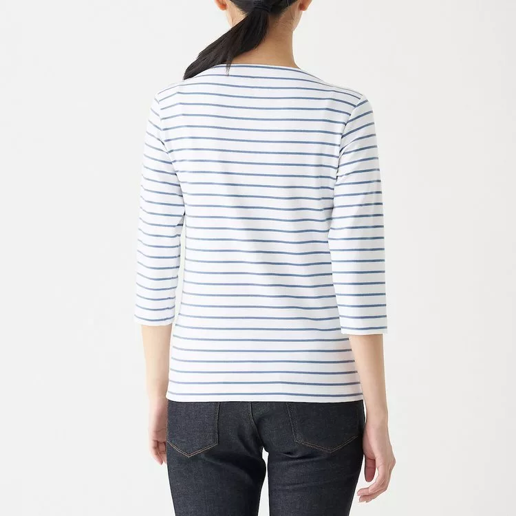 商品描述: [MUJI無印良品]女有機棉混彈性針織船領七分袖T恤XS煙燻藍橫紋